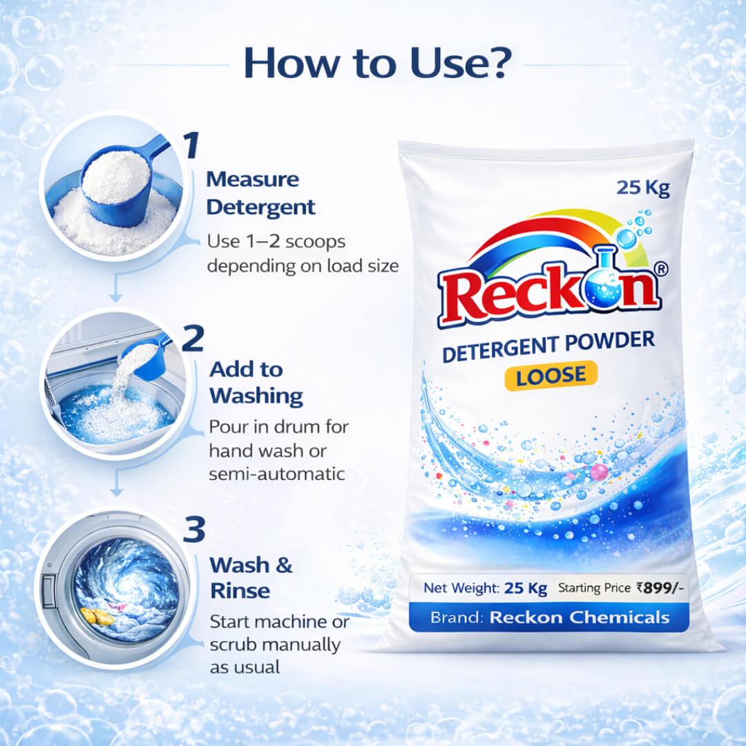Reckon Detergent Powder – Loose (25 Kg) is a high-performance bulk laundry solution specially made for commercial, institutional, and wholesale buyers. It delivers strong stain removal, good foaming, and bright wash results while keeping washing costs under control.